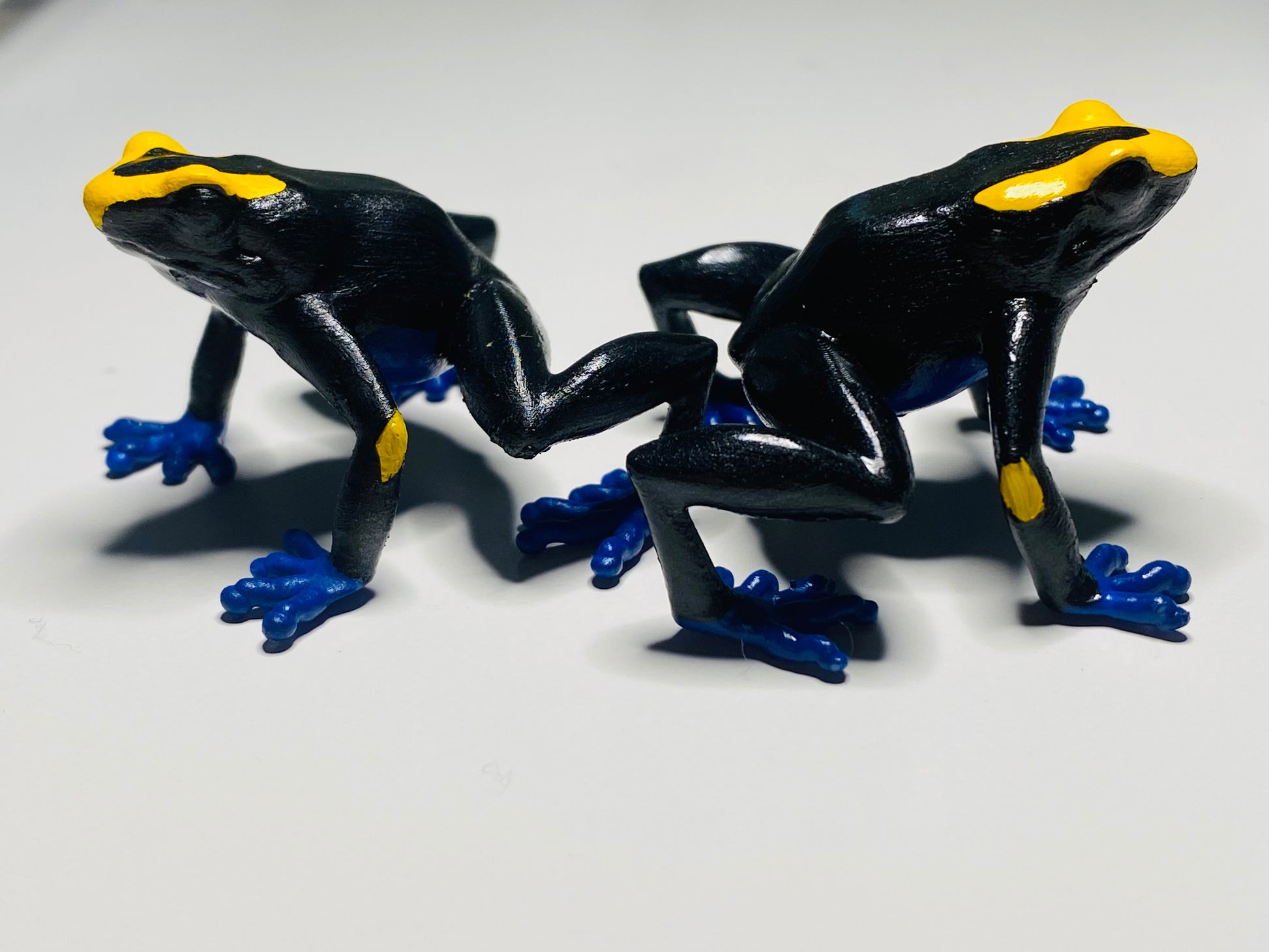 These 3D printed frogs are painted based on real species of frogs found in the wild and that are bred in captivity.