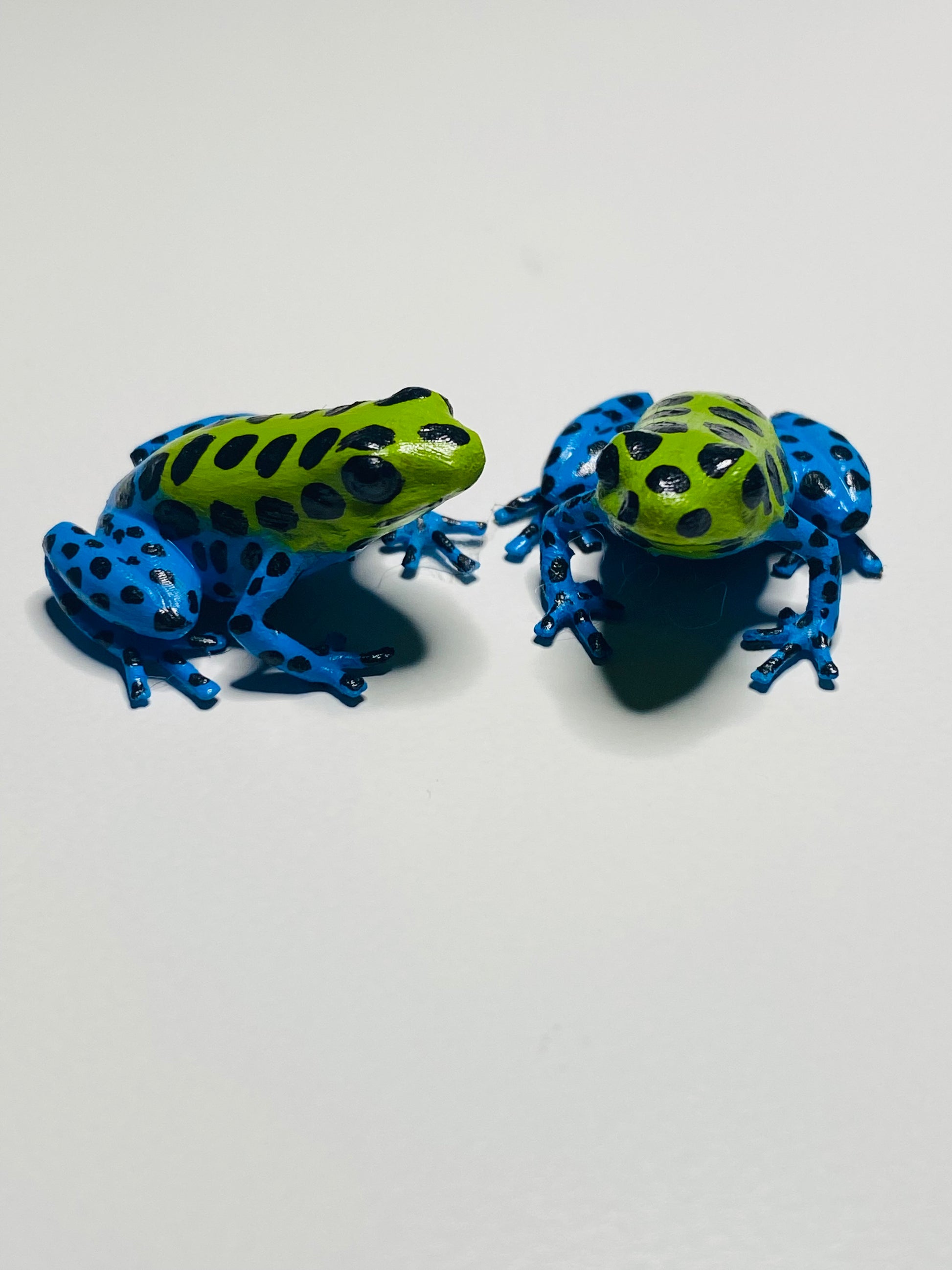 These 3D printed frogs are painted based on real species of frogs found in the wild and that are bred in captivity.